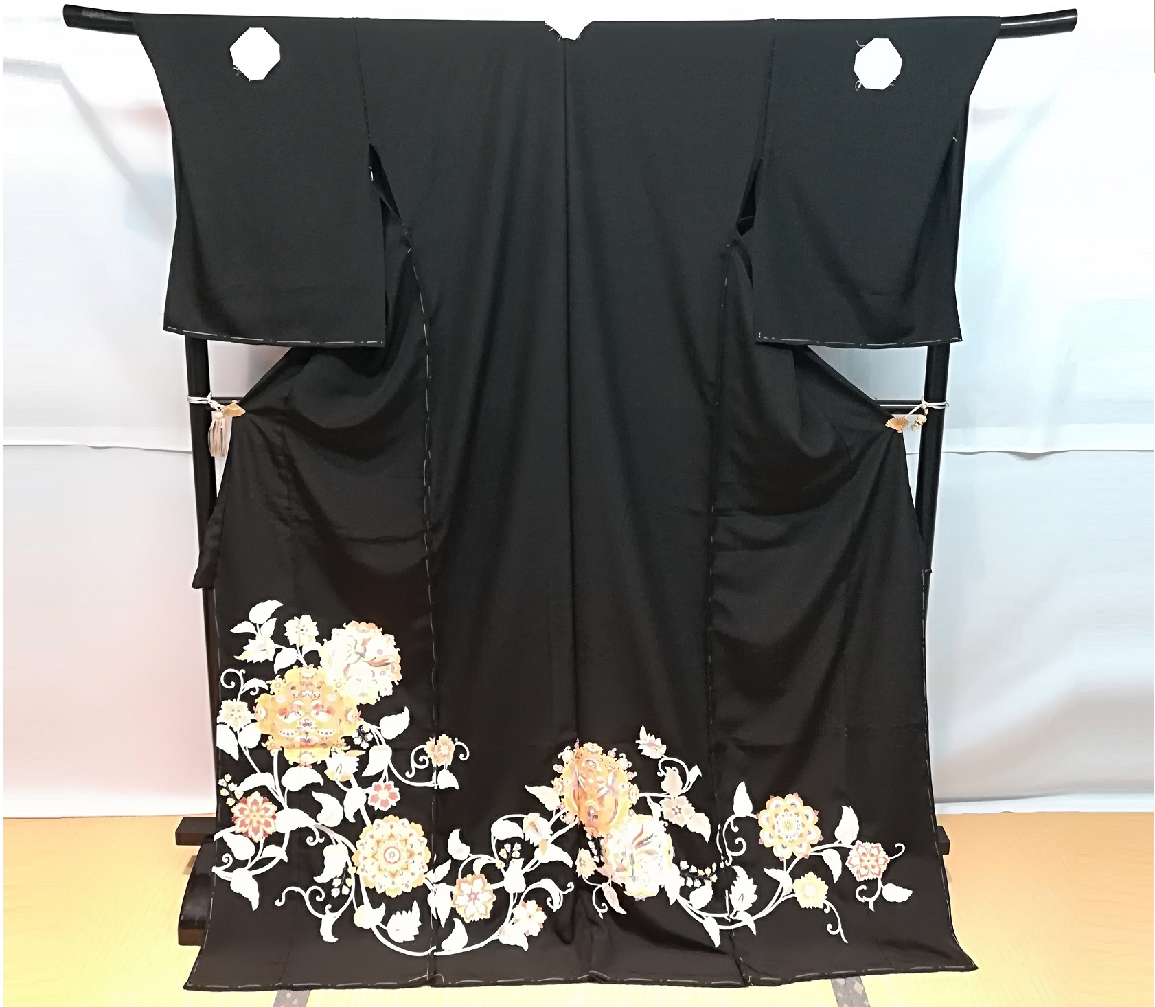 黒留袖は着物の全面・背中・袖に計5つの家紋が入っています。 着物の中でも格が高く、上半身は無地で腰下から裾にかけてめでたい柄の刺繍が入って います。既婚女性の第一礼服として新郎新婦の母親や仲人、兄弟姉妹の結婚式などで着用 されます。